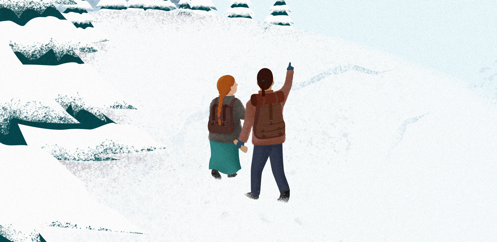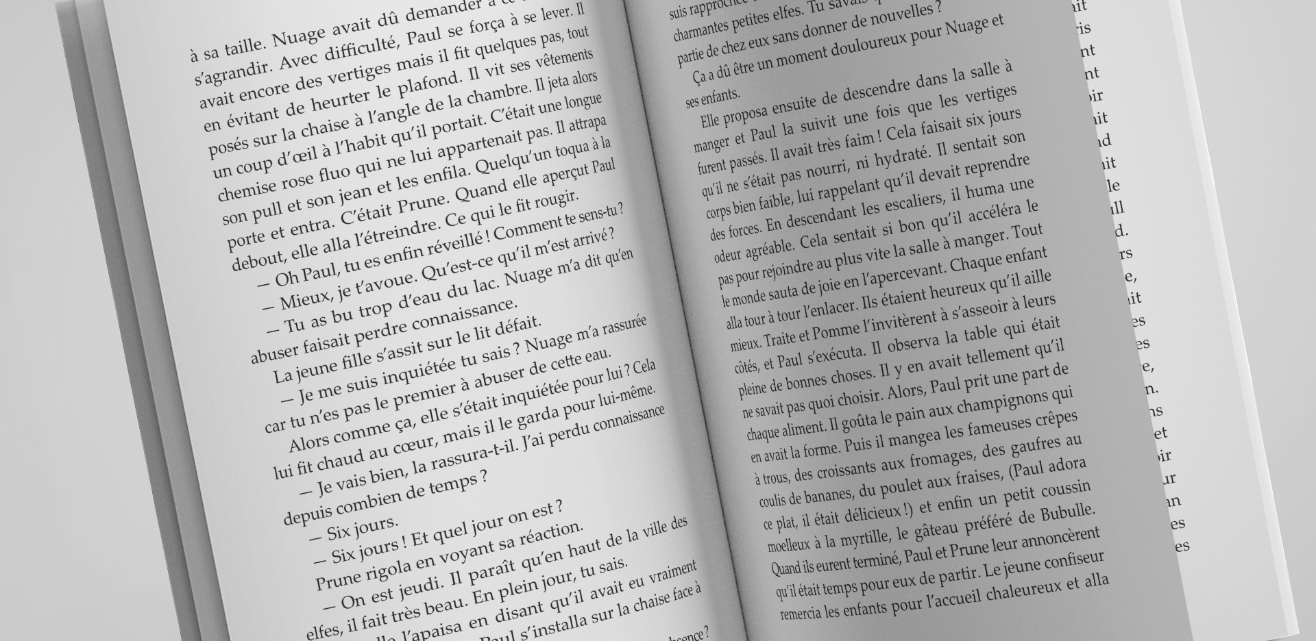 Mise en page du livre et création d'une illustration de couverture. Palatino est la typographie choisie pour le corps de texte, de la famille des garaldes elle est agréable pour la lecture. Pour une lecture plus facile le choix d'une hauteur de 12 pt s'est imposé car le livre est destiné à un public à partir de 11 ans. Le réglage des espaces, de la ponctuation et des tirets ont été réalisés selon les règles typographiques. L'illustration de couverture reflète l'épopée des deux personnages, Paul et Prune dans un décor enneigé. J'ai utilisé différents pinceaux et ajouté du grain pour accentuer l'aspect hivernal de la montagne.