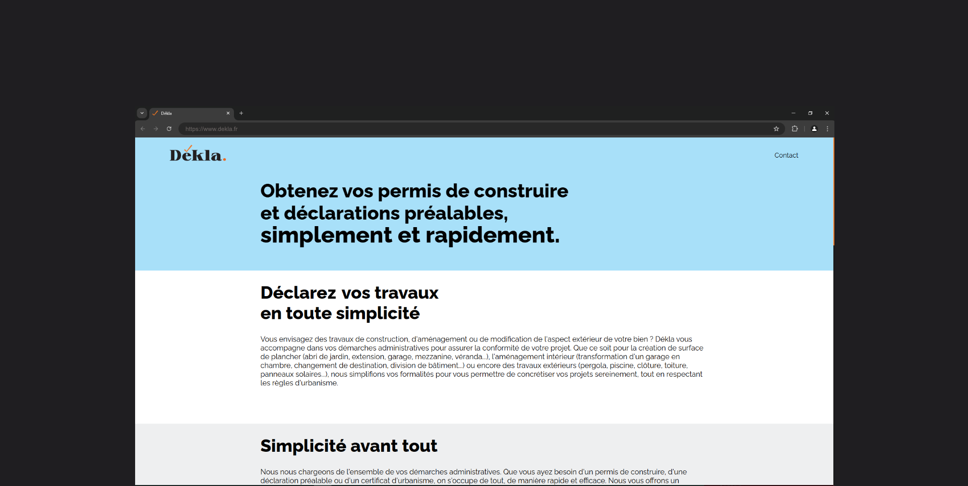 Dékla est une entreprise qui simplifie les démarches administratives de déclaration de travaux, de dépôt de permis de construire et de déclarations préalables pour ses clients.