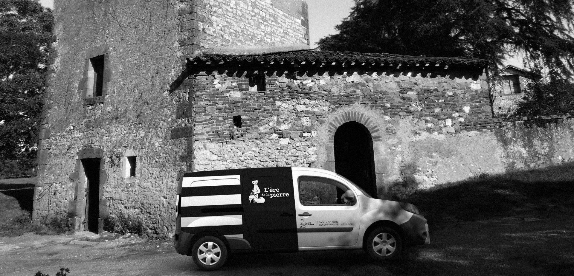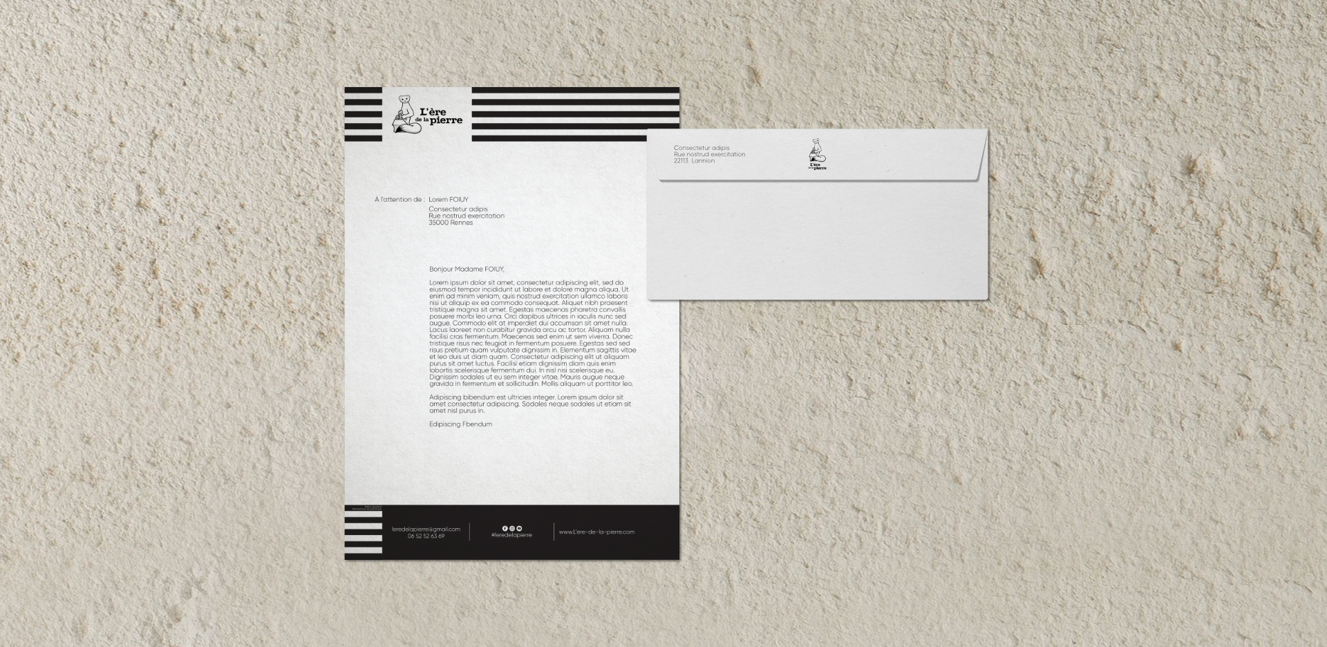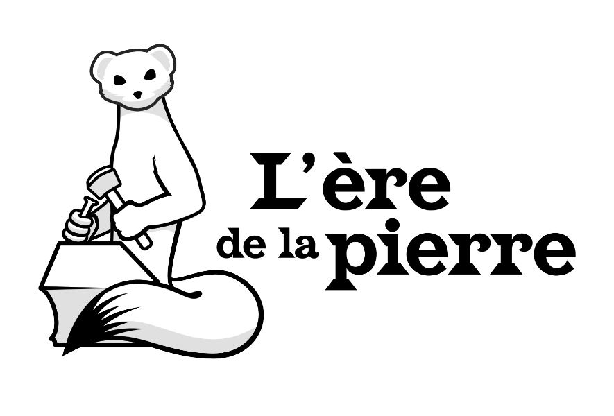 Création d'un logo et de plusieurs supports de communication. L'ère de la pierre est une entreprise artisanale axée sur la construction en pierre. Le client a souhaité mettre en avant l'identité bretonne, d'où le choix de l'hermine (élément emblématique de la Bretagne) comme mascotte dans le logo.Pour le nom, une typographie avec de gros empattements dont les angles rappellent la pierre taillée a été choisie. Le thèmes couleur noir et blanc s'est également imposé en rappel du Gwenn ha Du (drapeau de la Bretagne).